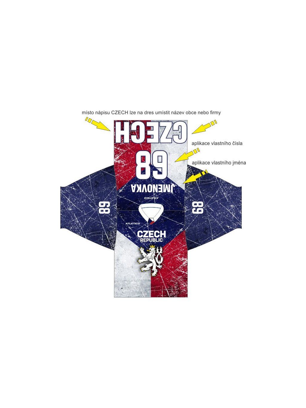 Na dres doplníme jméno a číslo, případně název obce nebo firmy dle vašeho přání. Požadované jméno a číslo, případně další potisky prosím napište do poznámky. Můžeme doplnit i loga nebo reklamy.